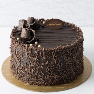 Our classic chocolate cake with fresh strawberry slices in between the layers. Garnished with strawberry halves and ganache.