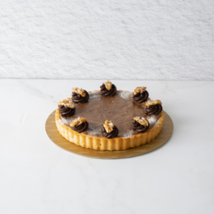 A layer of Nutella combined with a chocolate fudge filling topped with toasted chopped hazelnuts.